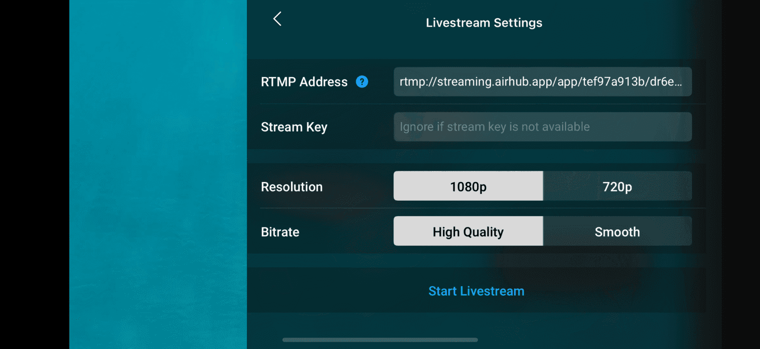 With the RTMP address configured, you can now start the livestream from within the Fly app. Select an appropriate resolution and bitrate based on your connection quality (720p often delivers reliable performance under variable network conditions). Tap Start Livestream and the countdown will begin.